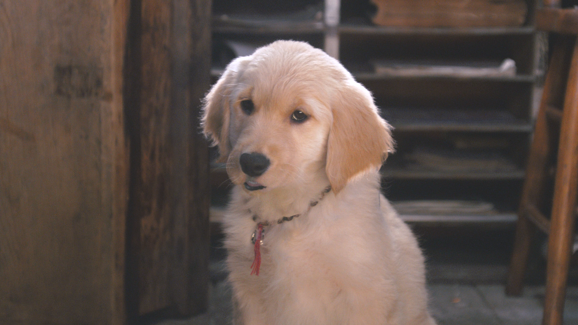 Buddha is a golden-furred male puppy. He wears a Buddhist collar made of beads.